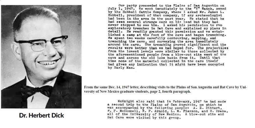 如果能找到当时在新墨西哥工作的考古人员似乎就可以证实葛拉第的说法,而且新墨西哥州真的是个人口稀少的州,即使在今天整个州也才200万人,在哪个年代则更少,而且大学也就那几所,所以调查的范围目标就很集中了,美国的民间调查人员顺腾摸瓜,找到了当时在新墨西哥州工作的考古人员,他们也大多予以否认,其中包括这位名叫Dr Herbert Dick(简称德瑞克)的哈佛毕业的考古学家,他否认有和罗斯威尔事件任何关联,而且否认曾到达葛拉第声称的位于圣奥古斯汀平原的现场,他于1992年去世,但在后来的一封他和哈佛大学的导师的信件中,明确了他在事发那段时间确实正在当地进行细致的考古工作,他撒了谎,但原因不得而知。