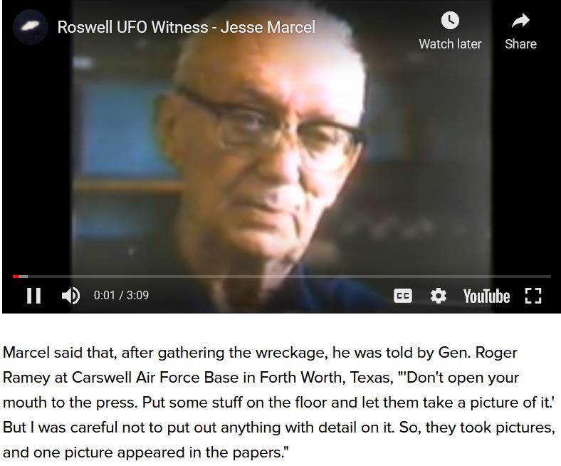 第一位就是该事件的主角,杰西·马西尔(Jesse Marcel)少校,他拿着气球碎片面对媒体镜头,拍下了那张经典的图片,在马西尔少校晚年,他向家人讲述了当年在罗斯威尔事件的 真实情况,军方让他在媒体面前用气象气球碎片向公众面撒了谎,实际情况是当时确实有飞碟坠毁及外星人尸体的发现,而且地点不止一个,而且军方还对外星人进行了转移及抢救,马西尔少校的儿子和女儿在父亲去世后也一直坚称父亲对他们的说辞,马西尔少校于1986年在蒙大拿州去世,事件发生的1947年,他隶属于509空中大队,就是向日本投原子弹的那个空军编队,即使在他退休后的,他在采访中也宣称当时的确是飞碟坠毁,尤其是1978,UFO调查员Stanton Friedman对马西尔(Jesse Marcel)少校的一次采访中,马西尔明确表示32年前那起事故确实是飞碟坠毁,而政府及军方为了掩盖事实然让他对公众撒了谎,并保持沉默,作为一个军方情报人员,他不可能连气球材料还是飞碟材料都分不清。