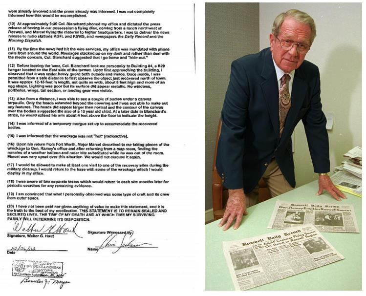 第二位改口的军方人员,就是当时对媒体公开宣布飞碟坠毁的军方发言人瓦特·韩特(Walter Haut),他和马西尔少校在当时都隶属于509大队,事件发生时,他被当时基地领导Colonel William H.Blanchard安排向媒体公布了飞碟坠毁事件,实际当时他并未去现场,向媒体陈述的一切也仅仅是按上级的要求所说,哪怕是后来的改口说成是气象气球,都是听从上级安排,而非亲临事发现场,但在数年后一次英国《太阳报》的公开视频中瓦特·韩特明确表示,当时坠毁的是外星飞碟,而且有10岁孩子大小的外星人尸体,视频录制于2000年,由瓦特·韩特好友Dennis Bathaser和Wendy Connors制作并保存,在他过世后向世人公布。