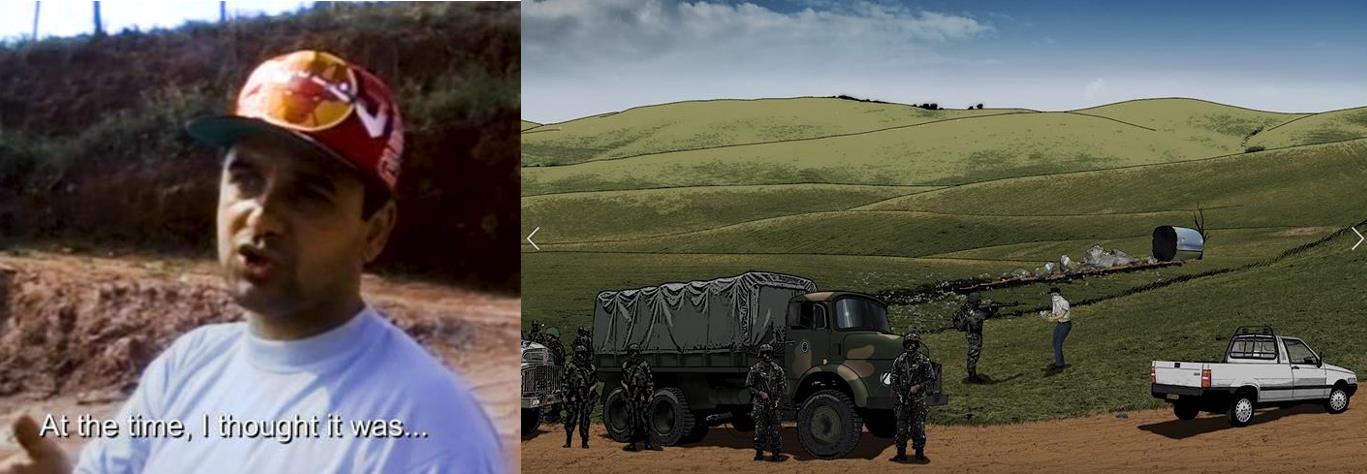 以上就是平民目击者大致经历的事件过程,而事件发生时,离当地20英里的ESA army base陆军基地则是整个事件最主要的参与者,2021年,几个当年在事件发生时,正在基地中服役的军方人员,接受了詹姆斯福克斯团队的采访,但大多以匿名不露脸的形式,讲述了事件发生时,他们在瓦尔任阿小城执行任务的经过,一个受采访的当时服役军人称,那几日,部队基地内人流涌动,有巴西海军的直升机频繁起降,并看到有海军的车辆卸载儿童棺材大小的金属箱子,并要求该陆军基地的人员离开其中的一座建筑大楼,而他的上级军官对他说,海军接收一些瓦尔任阿城收集来的不明物体,而他所在的连队还负责开车护送海军车辆,而他所认识陆军基地内参与过瓦尔任阿城军事行动的人,在事件发生后都调离了该基地,并再也没有在基地内出现过,其中包括一个他熟知的edson ramirez军官,后来听说他调去了首都巴西利亚.