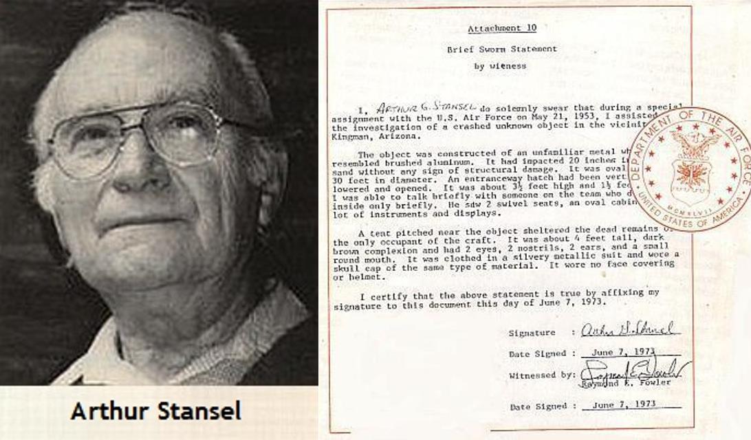 而后该爆料人被证实为美国军方的资深工程师,阿瑟·g·斯坦西尔(Arthur G. Stansel),1924年11月6日出生在美国俄亥俄州的代顿。在第二次世界大战期间,他在欧洲战区的美国陆军服役,曾参加诺曼底登陆,三次被授予紫心勋章。 战后他进入俄亥俄州立大学学习,1948年毕业,获得数学和物理学士学位。他还获得了北卡罗来纳州立大学柴油工程硕士学位。从1949年6月至1960年1月,斯坦塞尔在俄亥俄州代顿的赖特-帕特森空军基地担任过不同的工程及管理职位。在事件发生期间,他在特别研究办公室(office of special research)内的空军材料司令部(Air Force Materiel Command)工作。他当时的职责包括空军发动机测试单元的工程设计,开发确定爆炸对建筑物和结构影响的技术。后来晋升为莱特航空发展中心(Wright Air Development Center)航空实验室的负责人。这个职位使他成为赖特-帕特森空军基地的物资部经理。