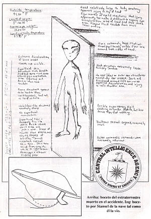 斯坦西尔的具体工作是根据撞击沙地的角度和深度,确定撞击时飞行器的前进和垂直速度有多快。撞击使飞碟陷进沙里约20英寸。斯坦西尔记得该碟状飞行器没有起落架,表面也没有任何破损或凹痕,甚至连划痕都没有。一名武装宪兵守卫着附近搭起的帐篷。斯坦西尔朝里面瞥了一眼,看到了一个四英尺高的人形生物的尸体,穿着一件银色的金属外套。它脸上的皮肤是深褐色的,它的头上有一个金属便帽装置。在场的每个专家一旦完成任务,就会通过录音机接受宪兵采访,并被护送回大巴车上。在回大巴的路上,斯坦西尔设法和另一个人简短地交谈了一下,他告诉斯坦西尔,他瞥了一眼飞船内部,看到了两个旋转的座位,还有仪器和显示器。一名宪兵注意到他们在一起交谈,就把二人分开,并警告不要互相交谈。