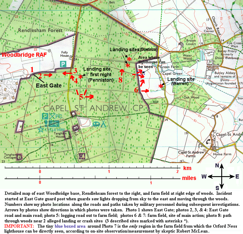 二人随即离开现场,凌晨4点多,也就是事发一个多小时后,当地警察被叫到现场,但报告说,警察在现场唯一能看到的灯光来自几英里外海岸上的奥福德尼斯灯塔。12月26日清晨天亮后,军人再次回到事发的森林东部边缘附近的一块小空地上,在地上发现了三个三角形的小印痕,以及附近树木上的燃烧痕迹和折断的树枝。10点30分,当地警方再次被叫来,这次是为了查看这些地面上的印记,他们认为这些印记可能是动物留下的,幸运的是警察拍摄了当时地上留下的三角形印记照片,这件事也很快被基地的查尔斯·哈尔特中校所得知,于是在 1980年12月28日凌晨,它带着几名军人再次考察了该地点。他们使用美国军用辐射测量仪an /PDR-27测量了三角痕迹区域和周围地区的辐射读数。他们记录到每小时0.07毫伦琴,相当于目前环保电视机的辐射量,但在其他地区,他们也检测到每小时0.03至0.04毫伦琴。
