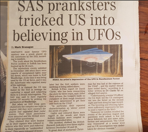 而最近一次关于蓝道申森林事件的解释,来自2018年12月英国不明飞行物研究人员大卫·克拉克(David Clarke)的报道,他称事件是SAS为了报复美国空军而策划的。根据这个故事,1980年8月,SAS空降到伍德布里奇皇家空军,以测试核基地的安全性。美国空军最近升级了他们的雷达,并在SAS人员降落到基地时发现了黑色降落伞。SAS部队受到美军人员的审问和殴打,他们被称为“身份不明的外星人”,这是对他们最大的侮辱。为了实施报复,SAS向美国空军“提供”了他们自己的外星人事件版本;“…随着十二月圣诞节的临近,人们在树林里布置了彩灯和彩色照明弹。黑色的氦气球也被连接到遥控风筝上,通过无线电控制将悬浮的物质送入天空,克拉克的调查得出的结论是,这个故事本身就是一个骗局