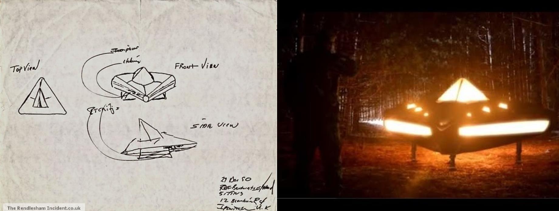 巴勒斯回忆说:“当他们沿着东门通往森林的路走下去时,这个光源也在向后移动,最后似乎停在一堆树上……此外,树林里亮了起来,你可以听到农场里的动物发出很多声音,树林里有很多动静。光源继续向开阔的田野移动……他们爬上了把树林和开阔的田野隔开的栅栏。可以看到一个农民的房子旁边的灯光。爬过栅栏后继续朝光源走去但光源消失了。”另外一人此时可能返回基地,而吉姆·彭尼斯顿陪同巴勒斯进入林地深处,然后就是整个事件的核心内容,二人发现了一个三米高,三米宽的三角碟状物体停靠在那里,彭尼斯顿后来回忆说。“它没有明显的起落架,但看起来腿是固定的。他靠近了一点并绕着物体走了一圈,最后,径直走到它前面。彭尼斯顿注意到外壳的结构更像是光滑不透明的黑色玻璃,上面有奇观的符号,
