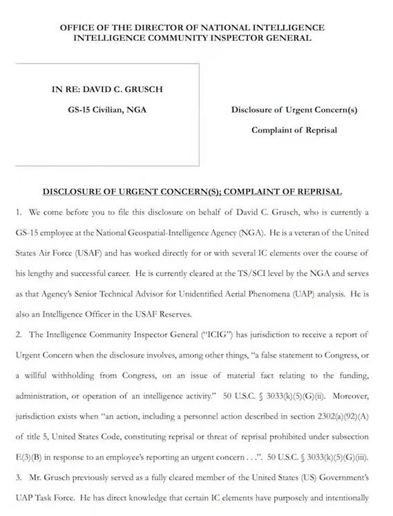 大卫·格鲁什于2023年四月离开之前工作的这些部门。2023年6月5日,the Debrief《简报》报道了独立记者莱斯利·基恩(Leslie Kean)拉尔夫·布卢门撒尔(Ralph Blumenthal)向他们提供的一份材料,内容详细介绍了大卫·格鲁什关于美国政府秘密藏外星飞船及外星人的说法,实际上他们也向主流媒体,《纽约时报》、《政治报》和《华盛顿邮报》等发送了消息,但都没拒绝,《华盛顿邮报》给出的理由是需要更多的时间来核实事实,就在同一日,美国国家新闻网NewsNation播出了罗斯·库尔哈特Ross Coulthart对格鲁什的首次采访。6月11日播出了这次采访的其他节选。在采访中,格鲁什声称,美国联邦政府维持着一项高度机密的UFO回收计划,并拥有多艘非人类制造航天器以及非人类驾驶员尸体,并强调这些不明飞行物不一定就是来自外星球,也可能是来自更高维度的世界。