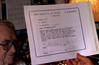 他还提到了鲍勃·拉扎尔(Bob Lazar),也是最初的51区爆料人,大坤哥曾在猎奇源5.1期中专门谈到他。布什曼证实了拉扎尔爆料中的内华达州的51区确实是测试外星飞船的地方,但在51区出名后,这种反重力测试转移到了犹他州的tooele图埃勒县。 他向大卫·塞雷达(David Sereda)展示的实际文件显示了一个带有反重力设备的飞机,和罗斯威尔飞船的第一架逆向工程反重力核动力飞碟,称该飞船1959年首次从俄亥俄州赖特帕特森空军基地起飞,并称自己认识组装该飞碟的工程师,布什曼还提到了四种基本力,strong force强力, electromagnetism电磁力 weak force弱力, gravity重力,此外他称在宇宙中还存在两三个未被发现的力,其中有一种与宇宙膨胀有关的未知力实际上比重力更强,这可能与反重力推进有关。布什曼还用磁铁,铜管和铝管作了磁力对重力影响的现场演示,并讲到爱因斯坦能量方程的傅里叶级数变换后的一些展开式可以显示出7种力,4种是目前已知的,而其他三种是目前还没有发现的,其中包括和反重力相关的未知力,