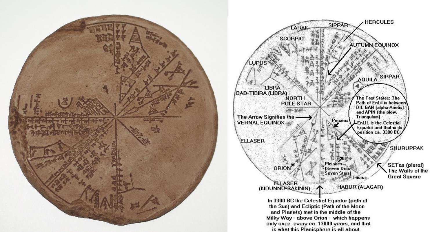 苏美尔人也是最早的天文观测者,他们跟踪恒星的运动,并确定了水星、金星、火星、木星和土星等行星。人们认为苏美尔人将行星视为神灵来崇拜,美索不达米亚的万神殿始于苏美尔人,其中许多神与行星联系在一起,希腊人和罗马人继承了这一传统。但不幸的是苏美尔人的大部分天文档案都丢失了,只留下极少部分相关文物,其中最具代表性的就是苏美尔星盘,这块圆形石盘是19世纪末亨利·莱亚德 (Henry Layard)在Nineveh, Iraq伊拉克尼尼微underground library of King Ashurbanipal亚述巴尼拔国王公元前650年的地下图书馆中发现的,不幸的是,这块圆盘上很大一部分文字丢失了,而长期以来,人们一直认为这是一块亚述时代文物,但通过计算机分析,它与公元前3300年美索不达米亚上空的天空相匹配,证明它起源于更古老的苏美尔人,而上面的文字内容直到2008年才被翻译,这块石碑记录了公元前 3100 年左右发生于奥地利的古代小行星撞击,即kofels impact event科菲尔斯撞击, 而苏美尔人是如何观测的这起远在数千英里之外的撞击事件,我们还无法得知。