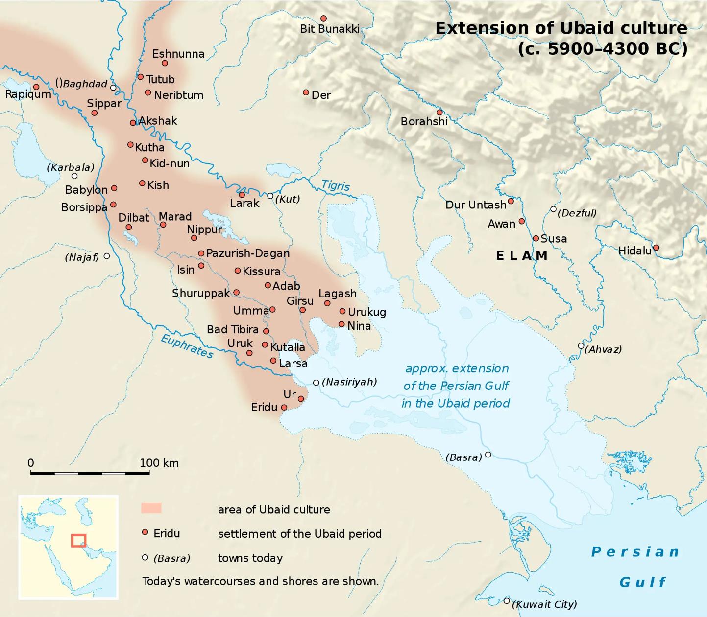 苏美尔文明被认为是在公元前 4100 年至公元前 3300 年之间由讲苏美尔语的西亚人,在迁入底格里斯河和幼发拉底河的流域之后发展起来的,事实上,在这群长着黑色头发的外族人迁入该地区之前,这里就生活着一批原住民,他们被称为为“Proto-Euphrateanss原始幼发拉底人”或“乌拜迪亚人Urartians”, 理论上是从美索不达米亚北部的Samarra culture萨迈拉文化演变而来的。尽管苏美尔人自己从未提及Ubaidians乌拜德人,但现代学者认为乌拜德人是苏美尔文化的第一股文明力量,因此近代学者将乌拜德人发展的当地文明归类到苏美尔史前文明,作为整个苏美尔文明的初始阶段,乌拜德人排干沼泽地用于农业,发展贸易,并建立了工业,包括编织、皮革制品、金属制品、砖石和陶器,创立了最初的乌拜德王朝,而后,与外来的苏美尔人融合,发展出后来几千年的苏美尔文化。