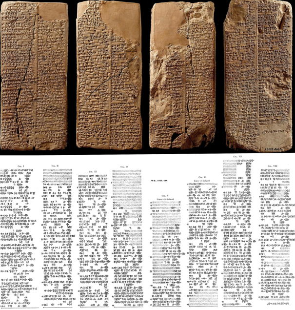 除了以上各种推断,还有更夸张的说法,来自天上,就是来自外星球,而且这还是最有证据及说服力的一个,就是出土的苏美尔人自己用楔形文字记载的泥板文献,“苏美尔王表”,记录苏美尔文明历届君主及其统治时间的文献,其实苏美王表有不同时期的不同版本,其中大部分可以追溯到古巴比伦时期,但最古老的版本可以追溯到乌尔三世时期。记录王表的泥板通常在美索不达米亚南部发现,这些版本在具体内容上有所不同,有些章节没有出现,有些章节以不同的顺序排列,国王的名字可能没有出现,或者他们统治的时间长短可能不同,这些差异即可能是复制错误的结果,也可能是经过深思熟虑的编辑决定改变文本以适应当时社会环境的需要。在已知的最古老的版本中,追溯到乌尔三世时期(公元前2112-2004年),但可能是基于阿卡德的原始材料,王表反映了从第一个获得王权的城市基什到阿卡德的权力过渡。在后来的古巴比伦时期的版本中,这个王表包括了大量的城市和这些城市之间的王权转移,也反映了王权如何来到一个城市,然后不可避免地被下一个城市取代的周期性观点。王表有一个明显的时间节点就是大洪水前和大洪水后,前者指史前,后者才是历史时期,从基什第一王朝到伊辛王朝,后者经考古认证已经有部分记载的城市被挖掘出土,最让学者困惑的是王表上提到国王的在位时间,不管是大洪水之前记载的一个国王几万年的在位时间还是大洪水之后一个国王几百年的在位时间,感觉都不符合我们的认知常识