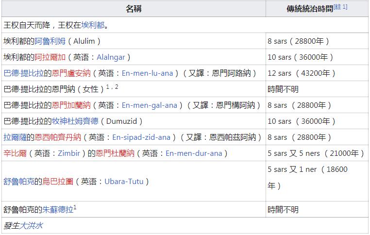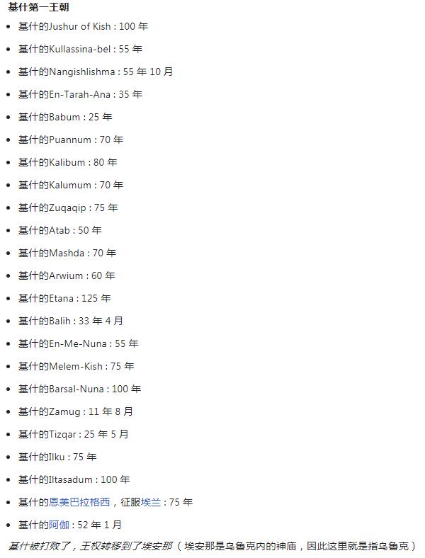 大洪水后各朝代的各君王执政时间如果按第一种翻译就是从上百年到几个月不等,但如果按第二种换算方式有的执政时间就变成了几小时,似乎更解释不通了,还有一个疑惑就是在大洪水后,即便不和大洪水前相比,历届的君王执政时间也是越来越短,就拿紧随其后的基什第一王朝和乌鲁克第一王朝相比,从几十年到上百年缩短到几年甚至几个月,王表各君王的执政时间对比相差太大,导致无论按哪种换算方式都解释不通。在学界的一些人看来这可能是古人夸大君王权威的一种体现,或者在古代传译的过程中产生的笔误,毕竟出土的大部分王表都是在巴比伦时期的手抄本,也就是在苏美尔前期王朝的几千年后,产生差错也是可以理解的,而还有一批学者则认为王表记录的信息没有错误,早期的君王就是掌权上万年,而且他没并不是地球人,而是来自外太空,就像王表中第一句话说得那样,王权自天而降,即使在大洪水后,也还是强调王权再次从天而降,当然世界各地古文明都有与上天神明降世之类的神话故事传说,例如中国的女娲造人及欧洲的古希腊神话,苏美尔人的神明降世的故事版本相比前者相对有点科幻化,也就是流传最为广泛的一个版本,说是一群住在尼比鲁Nibiru的外星人,被称为阿努纳奇(Anunnaki),因母星环境恶化,并需要黄金作为能源,因此来到地球开采黄金,并让地球上的猿人或者说史前人类作为劳役,但由于这些史前人类智力地下,无法完成一些基础性的社会工作,尼比鲁星人将其进行了基因改造,与自己的基因结合,制造出具有智慧的高等生命,就是早期的苏美人,因此苏美人的神话有早期帝王具备半人半神的传说,这一版本算是对苏美尔文明来历网络流传最广的一个,甚至还有考古佐证,说是一个6000年前的楔形文字泥板被从古苏美尔地区被挖掘,上面明确描绘了一个比冥王星距离太阳还远的行星,公转周期3600年,等等,且不说是否有考古泥板的证明,首选从天文学的角度来看,太阳系的基本架构早就已经确定,人类最先进的太空望远镜已经能观测到百亿光年外的行星变化,对近在咫尺的太阳系,如果真的存在这么一颗行星,不可能观测不到,那这一假说到底从哪来的呢?