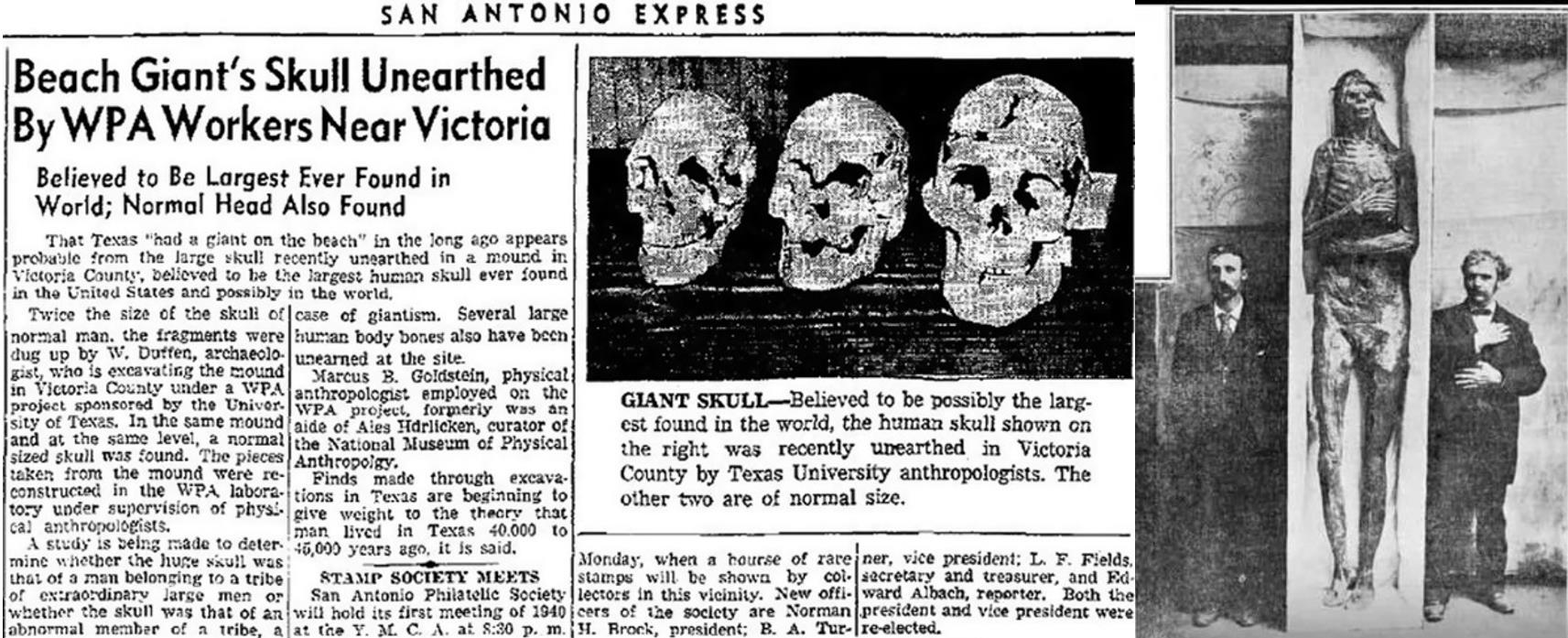 视线再回到北美地区,20世纪初,很多北美地区的印第安人遗留的大型土方工程如格雷夫溪丘和大蛇丘 Grave Creek Mound and the Great Serpent Mound,都曾被认为是一种之前生活在北美的巨人部落建造的,甚至还报道过对这些印第安土丘进行挖掘时还发现了巨型人类古骸,在那个年代包括纽约时报在内的众多媒体对发现的巨人骨骼进行过连续报道,甚至举办过巨人尸骨木乃伊的巡回展览,但早在1934年,美国史密斯学会就揭穿了巨人骨骼的谎言,都是恶作剧、骗局、捏造和对已灭绝的巨型动物的错误识别的结合,熟悉北美巨人传说和乳齿象骨骼的博物学家本杰明·史密斯·巴顿熟Benjamin Smith Barton在他《美洲部落和国家起源的新观点》一书中警告说,不要把“发现的巨大骨骼解释为史前巨人存在的证据,但还是有数以百计的报纸文章为了关注度依然对巨人骨架进行报道,例如,在田纳西州出土的一具巨大的骨架作为这个消失的种族的标本在该州巡回展出。重建的骨架被安装在一个站立的木框架上,用木头和生皮重建了缺失的骨头。传教士、医生和记者都确认它“属于人属”,尽管它的站立高度有20英尺。当这个庞然大物被带到新奥尔良时,医生威廉·卡彭特发现它是一头年轻的乳齿象的遗骸和人类尸骨的拼凑品。