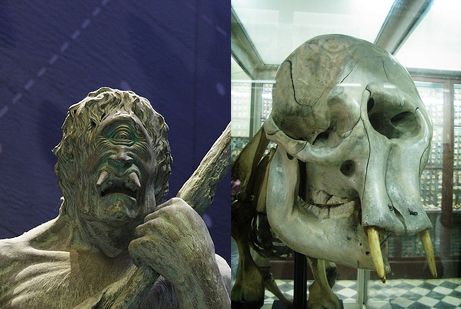 视线回到巨人文化的发源地欧洲和中东,独眼巨人一直是古希腊文献中记载的巨人代表,很多古代文献中还提到过发现了这些独眼巨人的骨骼化石,公元前五世纪的历史学家修昔底德说,西西里岛的“最早居民”被认为是独眼巨人,但早在19世纪初就有人解释了古人认为的独眼巨人的起源,古生物学家奥塞尼奥·阿贝尔(Othenio Abel)在1914年就指出,在意大利和希腊沿海洞穴中常见的更新世侏儒象头骨化石可能引发了独眼巨人的故事。Abel认为,头骨中较大的中央鼻腔可能被解释为一个大的单眼窝,而当洞穴中的人类尸骨和这些被人类狩猎的古代象的骨头混在一块的时候,还没有建立基本生物学知识的古人很容易将这些巨大的骨骼联想到巨人。