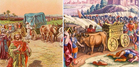 约柜在非利士人那里辗转多地呆了七个月后,非利士人根据占卜师的建议,把它归还给以色列人,并附上一份祭品,其中包括他们所患肿瘤和鼠疫形象的金色图像描述,以色列人重新获得约柜后,将它安置在Beth-shemesh伯示米人约书亚的田间,用于伯示米人献平安祭和燔祭。一些伯示米人出于好奇,注视观看了约柜。但他们当中的七十人被主击杀了。最后伯示米人将约柜送到Kirjath-jearim基列耶琳的Abinadab,阿比纳达家里,,阿比纳达的儿子以利亚撒Eleazar被封为圣人守护约柜20年。在圣经的叙述中,大卫王在统治联合王国之初,在极大的欢喜中从Kirjath-jearim基列耶琳取移走了约柜,但在约柜被送往锡安的路上,运载约柜的马车夫乌撒伸出手来稳住约柜,却因为触摸约柜也被上帝击毙,