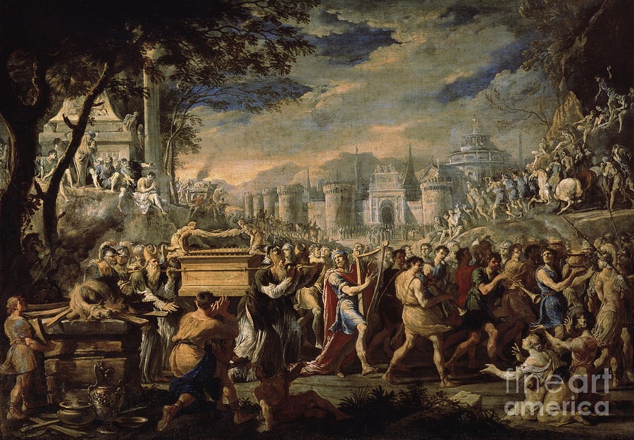 在以色列人完成对迦南Canaan.的征服后,约柜被保存在Shiloh示罗城,之后又被放置在伯特利bethel,由亚伦的孙子祭司非尼哈看管。后来,方舟再次被保存在示罗,在那里它由以利的两个儿子何弗尼和非尼哈看管, 示罗和伯特利在现代被认为是约旦河西岸的两处地点。根据圣经的叙述,几年后,以色列的长老决定将约柜带到战场上,以帮助他们对抗最近在埃本-以泽尔战役battle of Eben-Ezer中被击败的Philistines,非利士人。但这次以色列人失败了,损失了三万多人,约柜也被非利士人俘虏。非利士人把方舟带到了他们国家的几个地方,但每到一个地方都有不幸降临到他们身上。当约柜放在非利士人的dagon达贡神庙中,神庙中的神像在第二天就会莫名其妙地倒在约柜面前,非利士人把达贡神像归位,但第二天神像甚至支离破碎,当约柜先后被放置在Ashdod阿什杜德,gath加特和ekron以克伦后,这三个地区都先后遭受了鼠疫和癌症。之后约柜被相继被移走。