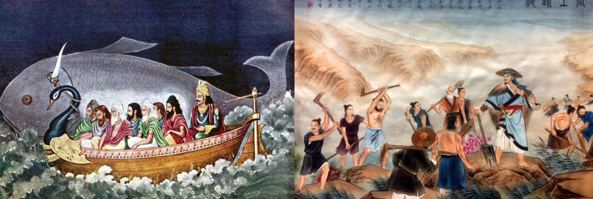 在亚洲,约公元前 6 世纪的印度神话史诗《沙塔帕塔婆罗门Satapatha Brahmana》和 《Puranas往事书》等文本,同样记录了一场大洪水,印度教主神毗湿奴的化身人鱼Matsya马茨亚警告第一个人类马努即将来临的洪水,并建议他建造一艘船,洪水来临时这只船拴在人鱼角上,安全地被引导到一处山顶躲过洪水。在中国,传说三皇五帝时代的大禹就曾领导华夏先民和泛滥的洪水斗争,因此留下大禹治水的故事。在美洲,夏安人是北美大平原的一个部落,他们相信一场改变了他们历史进程的洪水就发生在密苏里河谷。南美洲的阿兹特克人相信在现在的宇宙之前已经存在四个世界,第4个世界被一场持续 52 年的巨大洪水终结,只有一男一女幸存下来。