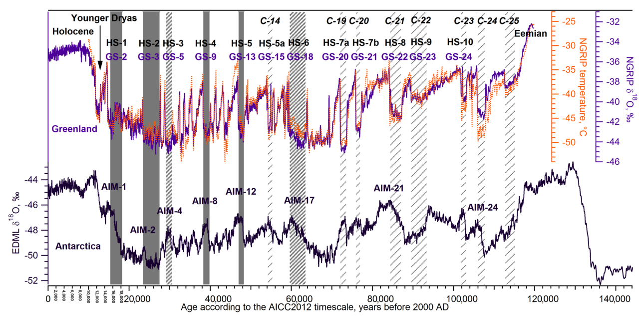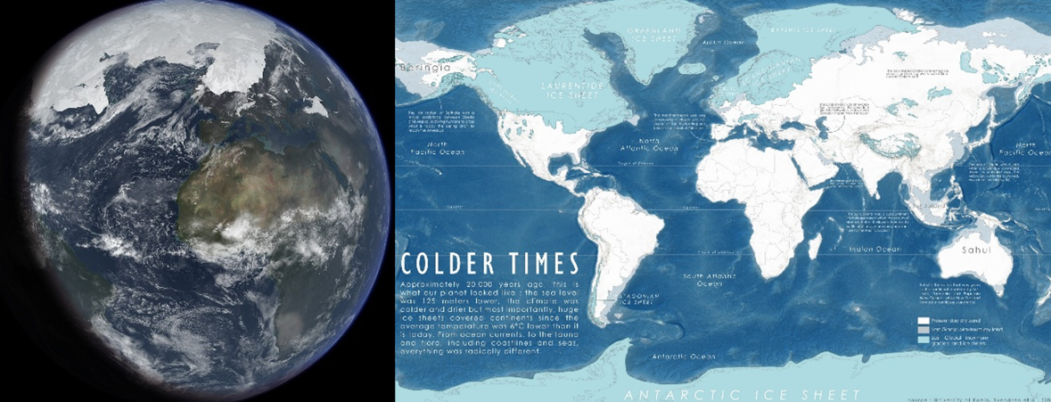 这段时间气候比今天要寒冷的多,当时海洋中蒸发的水分不是以雨水的形式回流补充海洋,而是以雪的形式落下,最后在地表形成冰川,地球表面的淡水大多以冰的形式存在于两级,因此,当时的海水比今天少很多,海平面也要比现在低400 英尺约120米,美国东海岸比今天远 75 到 150 英里,曼哈顿和巴尔的摩在当时甚至是内陆城市,但全新世的到来,让气温升高,两级冰盖融化,大量的淡水融化后从两极流入低纬度地区和海洋,直到8000年前,海平面才达到今天的水平,在这一过程中,很多之前生活在低海拔的人类定居点和古代文明,可能被海平面上升或突如其来的融化雪水所淹没,这可能就是全球不同地区的远古文明都有洪水传说的原因,