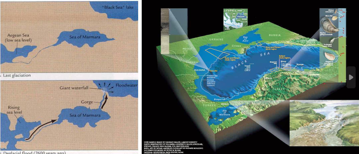哥伦比亚大学拉蒙特-多尔蒂地球观测站(Lamont-Doherty Earth Observatory)地质学家威廉·瑞安 (William Ryan) 和沃尔特·皮特曼 (Walter Pitman) 曾在 上世纪90 年代后期提出过黑海启示录假设,该理论认为,曾经是淡水湖的黑海沿岸土地肥沃,古人在这里建立了早期的大型农业社会,而在上一个冰河时代结束时,黑海变成了地中海泛滥引发的灾难性洪水的盆地,两位地质学家推测,近 12000 年前,欧洲冰川融水开始向北流入北海,剥夺了黑海的主要补给来源。黑海的水位开始下降,其北部边界大部分地区,即今天的克里米亚和亚速海变成了旱地。此时,黑海的水位比地中海的水位低几百英尺,两者被博斯普鲁斯海峡陆地屏障隔开,这种连接世界的海洋上升而黑海下降的情况不可能永远持续下去。最终,就像浴缸溢出一样,地中海大约在 7,600 年前突破了博斯普鲁斯海峡涌入黑海盆地。流入的海水在涌入时挖出了一条 300 多英尺深的通道,加深的通道让海水倾泻而下,形成了一个体积是尼亚加拉瀑布 200 倍的大瀑布。在一天之内,流过河道水足以覆盖曼哈顿,深度至少是世贸中心高度的两倍,在100 英里外也能听到层叠水流的咆哮声。在接下来的一年内,黑海的水位每天增加 6 英寸(15 厘米),大约 60,000 平方英里的土地被吞没并消失在不断上升的海水下,最终淡水湖黑海变成了咸水海洋。