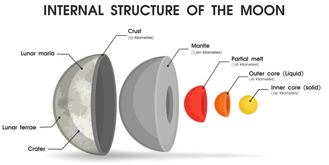 另外一个月球表面的主要特征就是除了这些陨石坑之外的低洼区域,在人类技术水平不发达的过去,这些区域一直被观察为颜色暗淡,被误以为是月球上的海洋,简称月海,而世纪实际上这些区域是大约12亿年前,月球的火山活动在当时很活跃,喷发后冷却的岩浆平原, 形成了这些看起来很暗的低洼区域,而月球的整体成一个非常轻微的不等边椭球体,这是由于和地球之间引力导致潮汐现象的拉伸所形成的。除了以上介绍的这些月球外部特征,月球也有和地球类似的内部构造,即地壳、地幔和地核。月球有一个富含铁的固体内核,半径可能只有240公里,一个主要由液态铁组成的流体外核,半径大约300公里。核心周围是一个半径约500公里的部分熔融边界层这种结构被认为是在45亿年前月球形成后不久,通过岩浆海洋的分离结晶而发展起来的。