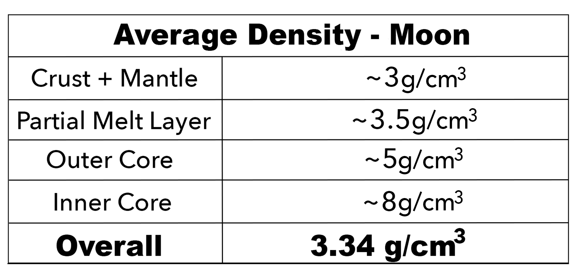 阴谋论曾拿月球的密度比地球小这一事实,以支持月球是空心的说法。我们知道,月球的平均密度是3.3 g/cm3,而地球的平均密度是5.5 g/cm3,但主流科学认为,这种差异主要是由于地球上地幔和地壳的密度低于其沉重的铁核造成的,而月球的内核现对较轻。另外一个被认为是月球空心论的证据来自阿波罗登月计划期间,1969年11月20日,阿波罗12号故意将登月舱的上升段撞向月球表面;美国国家航空航天局报告说,月球“像钟一样”响了将近一个小时,这导致了月球一定像钟一样中空的争论。[1]从那以后的月球地震学实验表明,由于行星地层的质地、类型和密度不同,月球表面有浅层月震,其表现与地球上的地震不同,但没有证据表明月球表面有任何大的空空间。